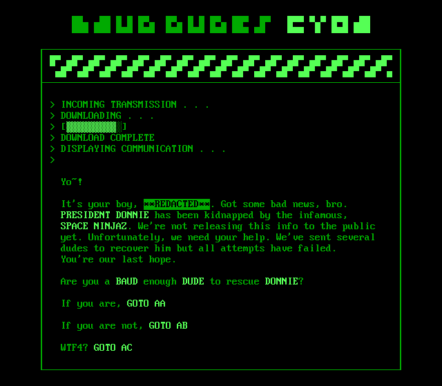 20 CLS PRINT " please note there are dozens of endings so definitely worth a few replays" PRINT " OK new phone who dis ? " PRINT " (A) a cool Dad" PRINT " (B) a cool non-dad" PRINT " (C) a non-cool dad" PRINT " (D) neither cool nor dad"